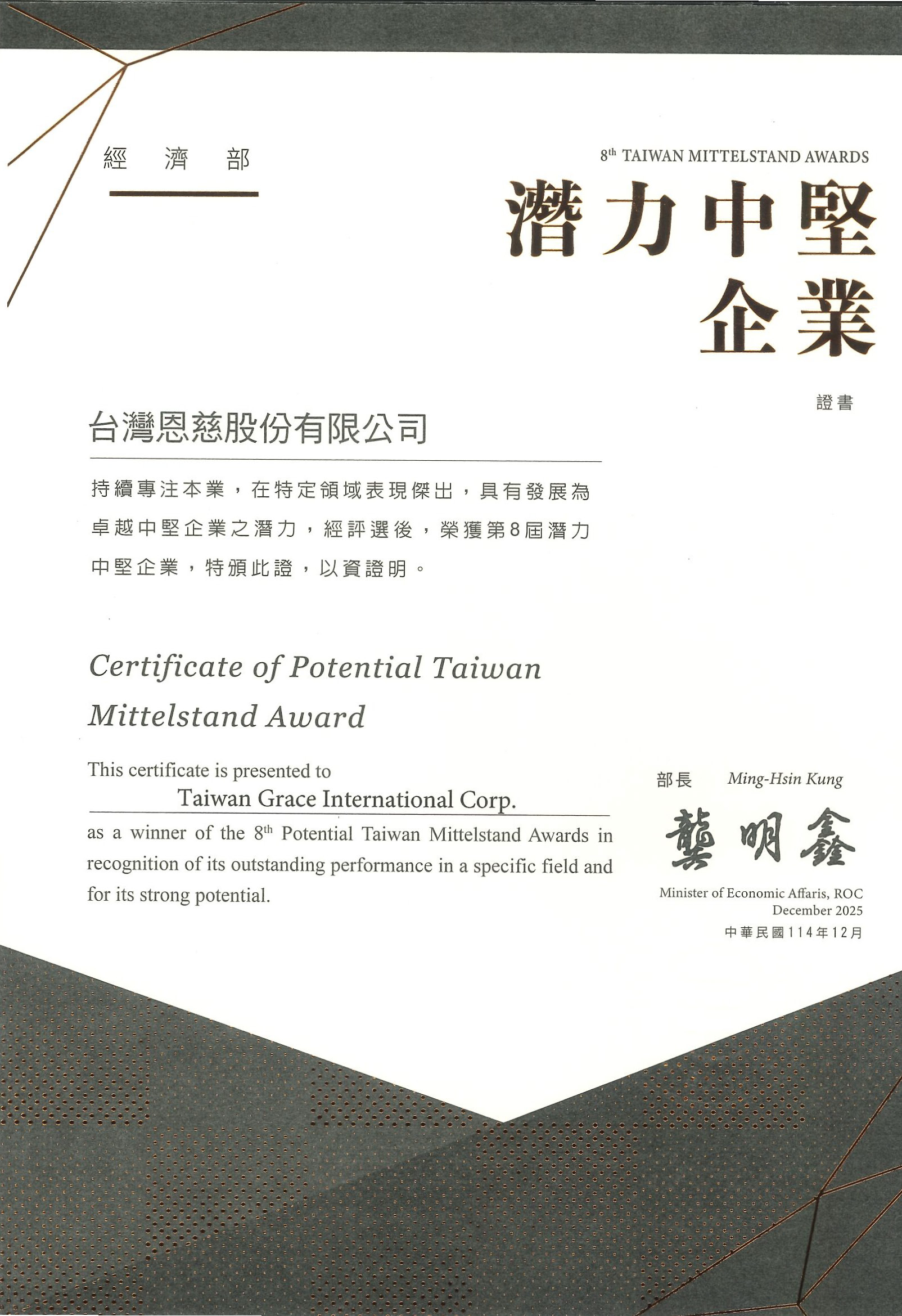 獲頒經濟部潛力中堅企業獎 |